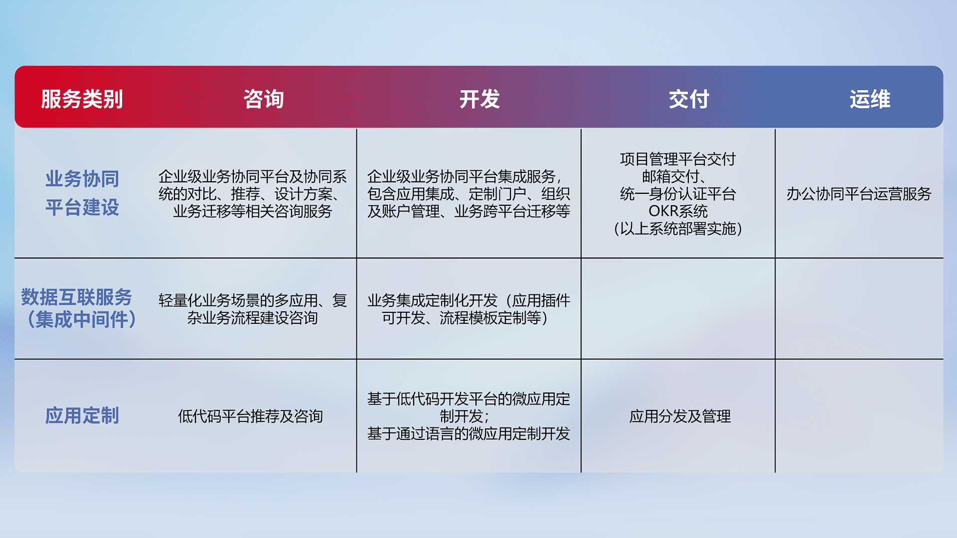 针对钉钉、、、企微、、、、IDaas等平台级产品提供产品的规划、、、、方案、、交付、、、、定制化开发等服务,,,实现如统一协同办公、、智能客户服务、、、混合会议管理、、、、智能数据查询、、、、等业务场景,,,,实现数字化转型。。