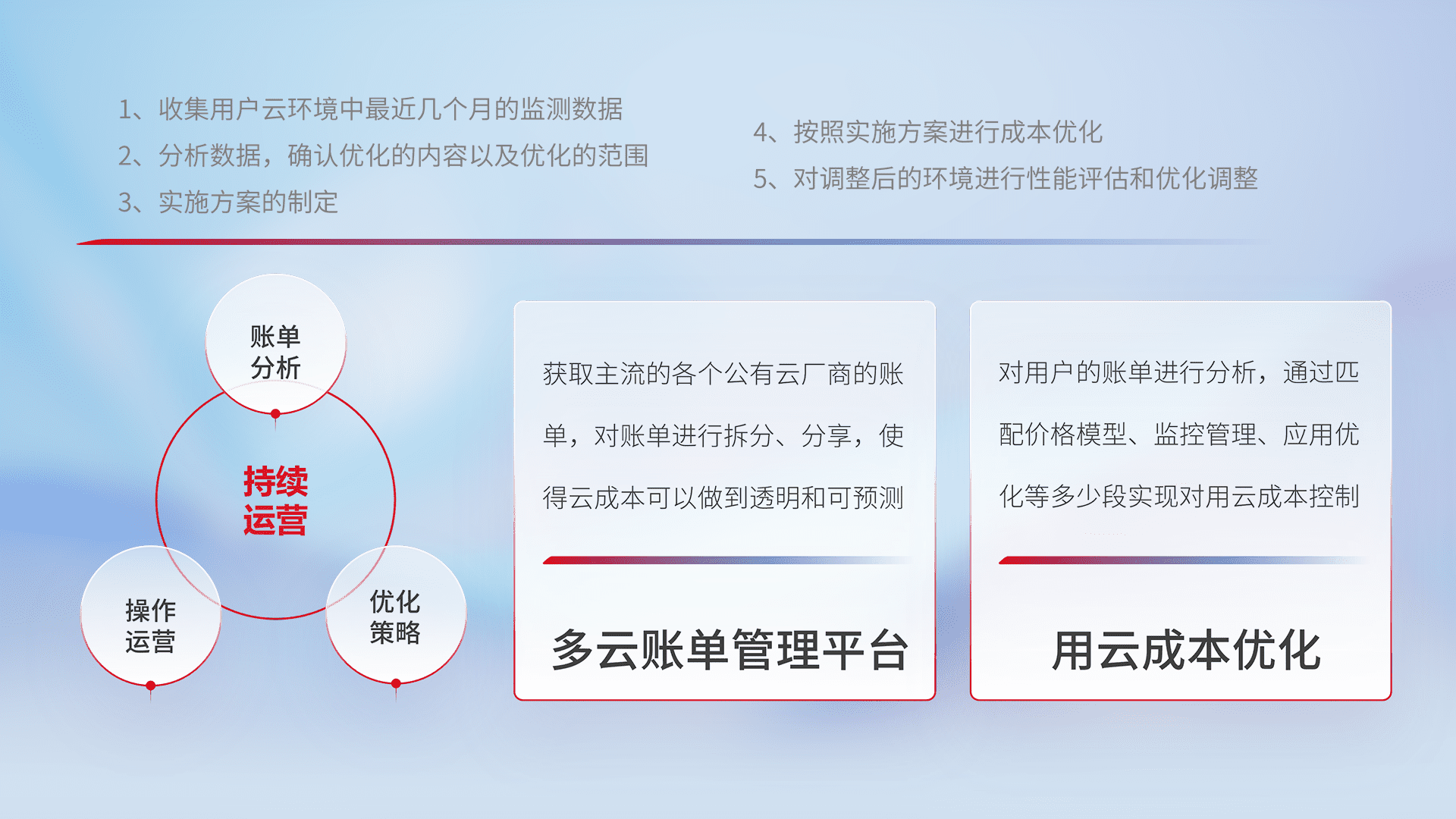 通过多云纳管,,以统一的资源数据模型把客户的云资源进行抽象和封装,,进而实现对多云资源的统一操作,,保障云资源管理的可靠性、、、稳定性与可用性。。量身定制化运维内容,,,,配置、、开发运维、、补丁管理、、、备份、、、监控、、、认证和访问管理、、审计和日常巡检等,,保障在用云过程中的可靠度,,稳定度以及高可用率。。。。